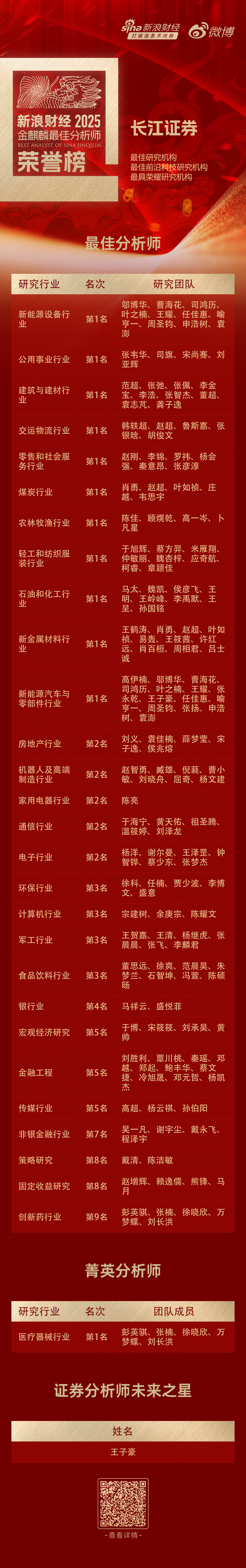 最佳分析师荣誉榜,长江证券荣获27个领域研究大奖,11个行业荣获第一名;菁英分析师荣誉榜,长江证券荣获1个领域研究大奖;长江证券新能源汽车与零部件行业分析师王子豪荣获金麒麟证券分析师·未来之星殊荣。名单如下: